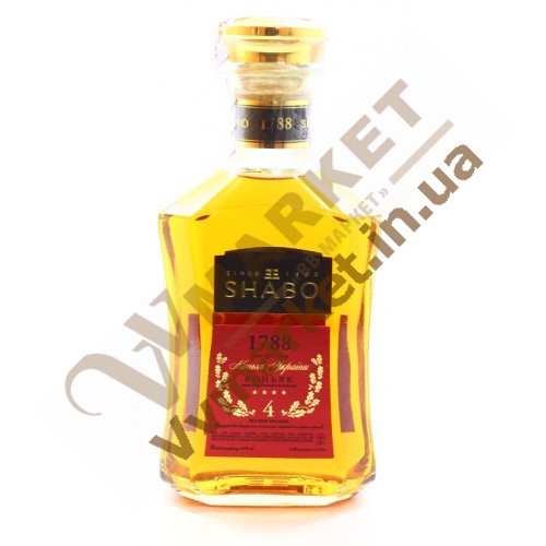 КОНЬЯК УКРАИНЫ ШАБО ШАБО 1788 Коньяк Украины ординарный четыре звезды. Для получения коньячных спиртов использованы Алиготе, Ркацители и другие белые сорта винограда. В состав коньяка входит ассамбляж коньячных спиртов высокого качества разных лет выдержки: от 4-х до 10-ти лет.