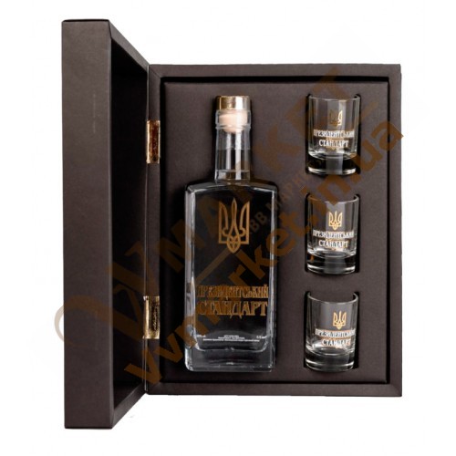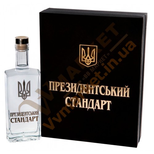 Водка элит-класса. В подарочной коробке с тремя рюмками. Прямоугольная форма бутылки показывает серьезность напитка. Имеет особый вкус в лучших традициях классических водок и обладает исключительной мягкостью. Изготавливается из высококачественного зернового спирта "Люкс", очищенной природной кристально чистой воды и натуральных компонентов по классической технологии изготовления украинских водок. Неповторимый вкус и мягкость «Президентського стандарта» достигаются за счет особой технологии и специальных добавок.
