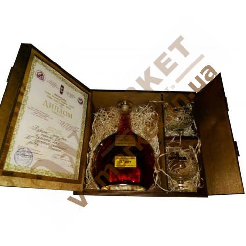 Великолепный старый коньяк в наборе с 2 бокалами в декоративной деревянной упаковке.
